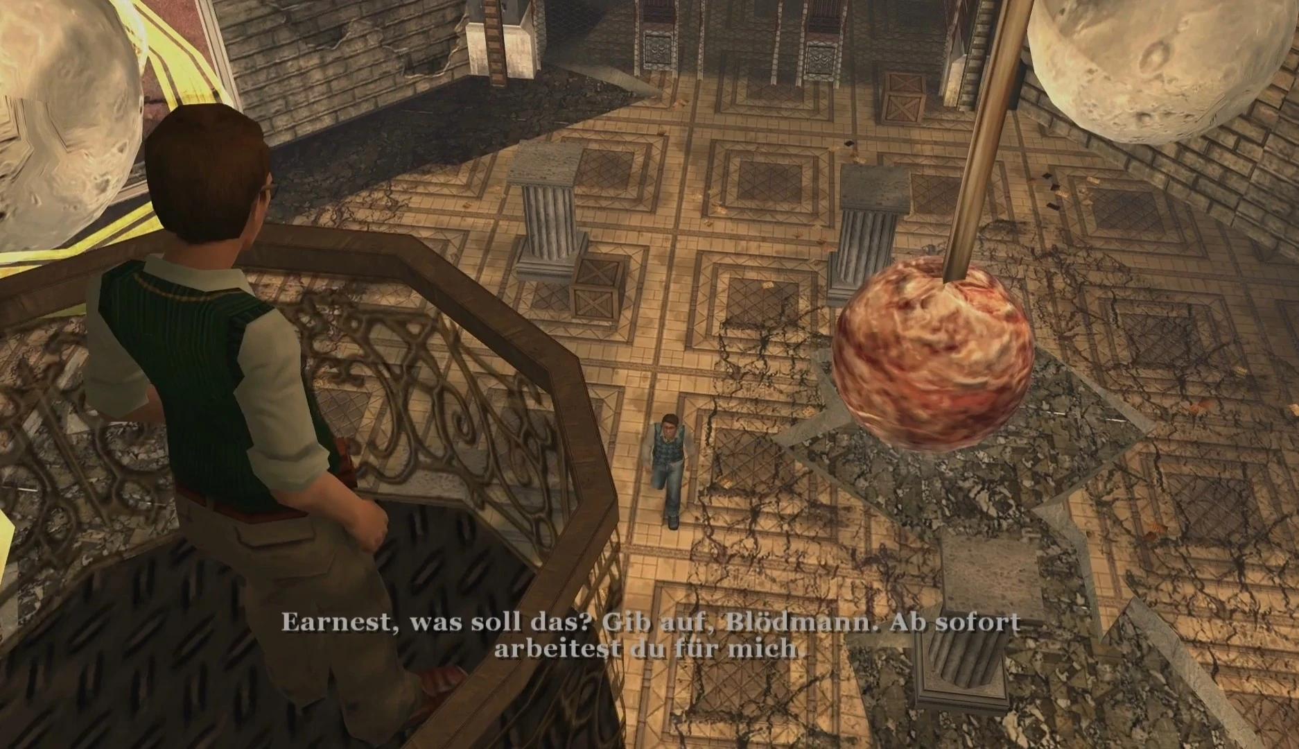 Der Bosskampf ist in drei Teile aufgeteilt. Earnest befindet sich oben auf dem Laufsteg und das Geländer verhindert, dass Jimmy direkt auf ihn schießen kann. Unten auf dem Boden, wo sich Jimmy befindet, sind Säulen, hinter denen er sich vor Earnest's Angriffen schützen kann.