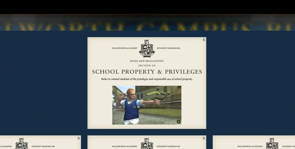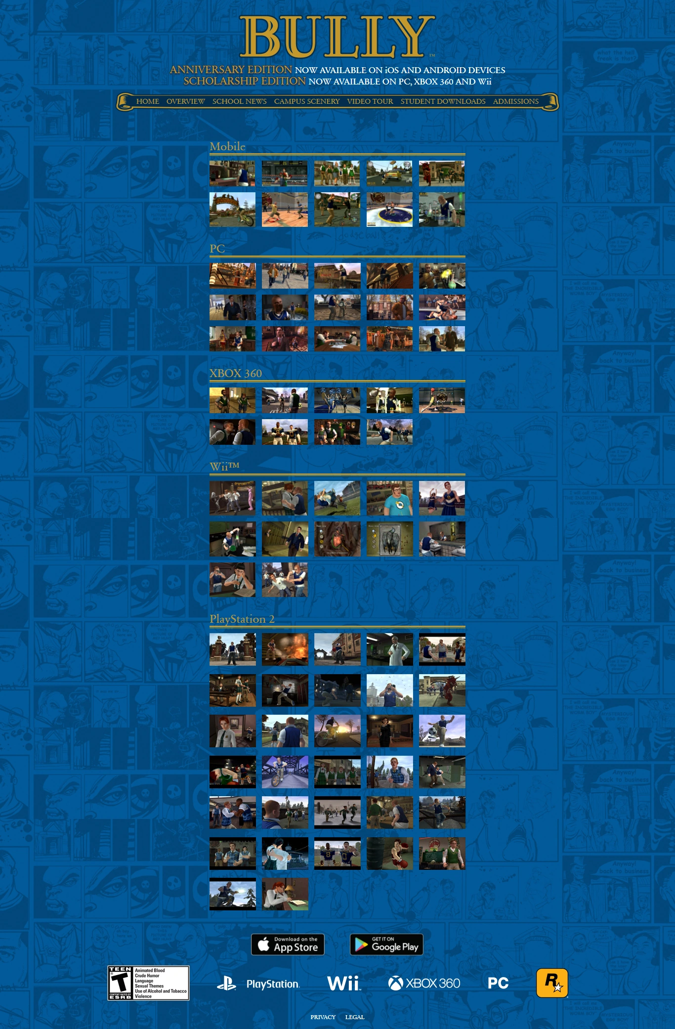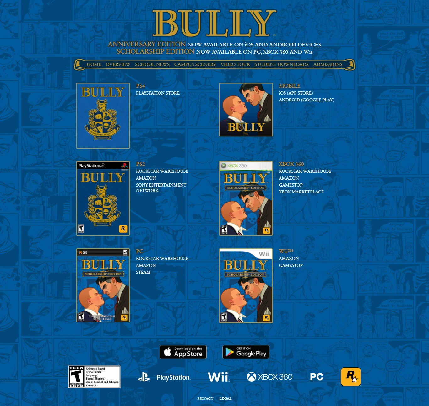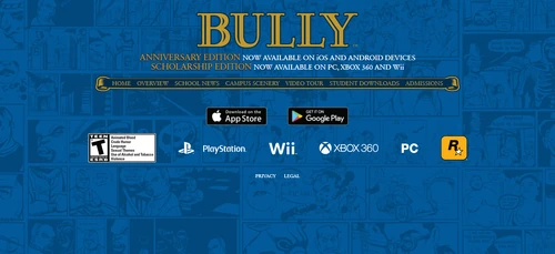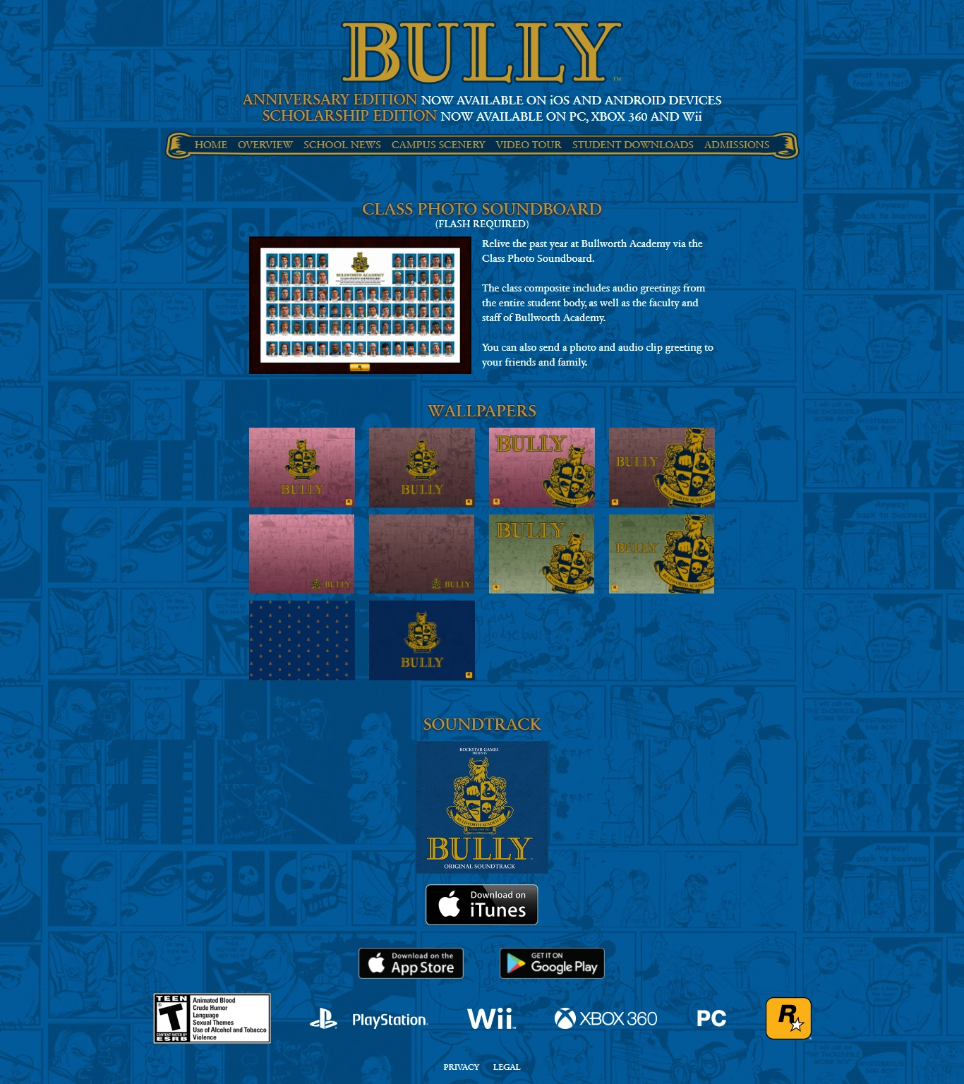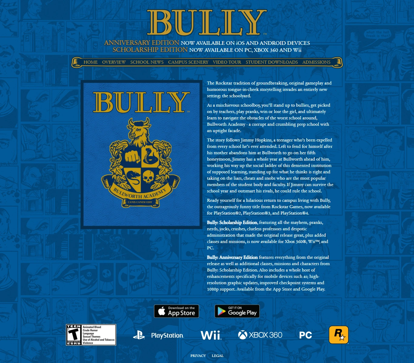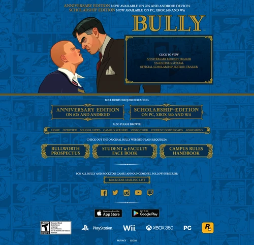 Rockstargames.com/Bully is the URL for the official promotional website for Bully, owned and operated by Rockstar Games. The Flash website, containing the Bullworth Academy Prospectus, Facebook and Rules, went offline at some point before 2015. Later the full Flash website went down due to end of support for the Adobe Flash Player on December 31, 2020.