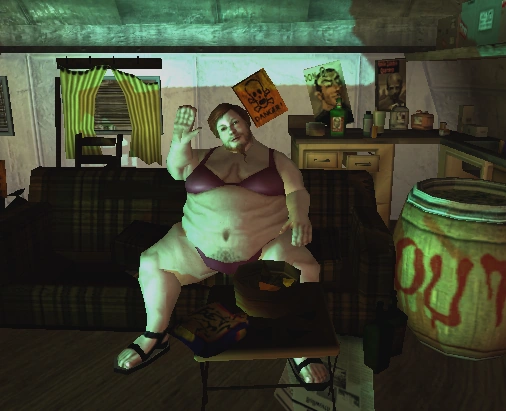 Paris is a morbidly obese, bearded woman. She wears a purple sleeveless tee and black shorts, occasionally wearing a purple-red bikini instead. She can be found in the second room in the Freak Show, binging on nachos and commenting on the television programs and commercials.