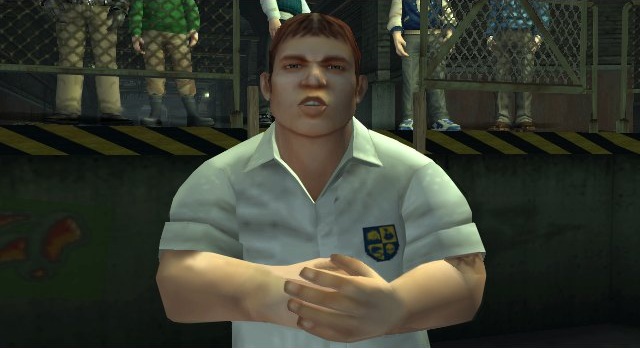 Russell remains a dangerous antagonist for all of Chapter 1, although as he never attends class. He can usually only be found in out-of-the-way areas such as the School Parking Lot where the other bullies are often seen, or beside the main gate of the campus, making him easy to avoid. Jimmy does have a run-in with him in the dorm hallways on Halloween, but he can be bypassed by quickly leaving the dorm. At the end of Chapter 1, Gary gets Russell to fight Jimmy in The Hole by claiming he insulted him, hoping to get him beaten up in front of the entire school. When Jimmy wins the fight, Russell, along with the other Bullies, becomes his friend and firm ally for the rest of the game.